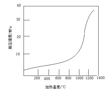 黏土耐火澆注料在加熱過程中,發(fā)生一系列的物理化學(xué)變化。這些微觀上的變化,在宏觀上就是其強(qiáng)度變化特征(見下圖)從圖中看出,隨著加熱溫度的不斷升高,其耐壓強(qiáng)度也增大,特別是在800~1000℃時,強(qiáng)度由10MPa左右驟然增到31MPa以上,隨后強(qiáng)度增大較少。