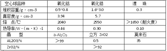 人造空心球品種有氧化鋁、氧化鋯、莫來(lái)石質(zhì)、鋁鎂質(zhì)和鎂鉻質(zhì)等,在耐火澆注料中應(yīng)用最多的為氧化鋁空心球:粉煤灰漂珠也是一種空心球,是由粉煤灰中提取的,是生產(chǎn)輕質(zhì)磚的良好原料,也是配制耐火澆注料的良好外加物。下表為空心球的主要性能。