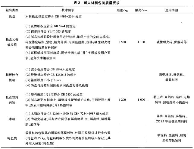 建設(shè)方與耐火材料供應(yīng)方在訂立合同的時(shí)候除約定材料質(zhì)量、付款方式、交貨日期等事項(xiàng)外,還應(yīng)當(dāng)包含耐火材料包裝質(zhì)量要求(見(jiàn)表3)。合格的包裝質(zhì)量及要求防雨、防潮、防震、防碰撞、防破損、防滲漏等保護(hù)措施,又要滿足堆摞要求、叉車和吊裝要求等。