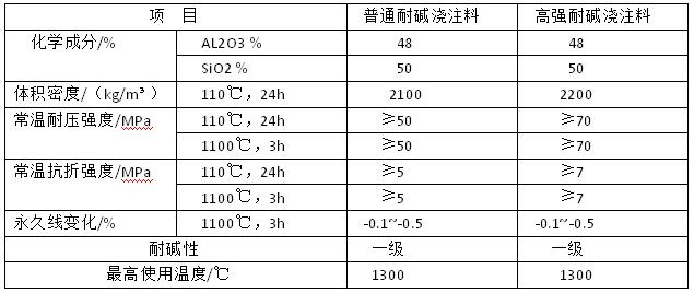 根據(jù)使用環(huán)境和條件不同,耐堿耐火澆注料有輕質(zhì)和重質(zhì)之分,氣孔率大于45%的為輕質(zhì)耐堿澆注料,氣孔率小于45%的為重質(zhì)耐堿澆注料。而重質(zhì)的又可分為中溫耐堿澆注料和高溫耐堿澆注料。