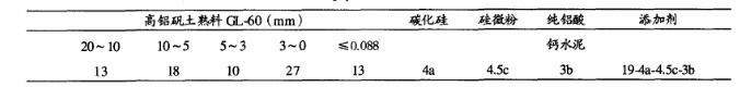 不定型耐火材料生產中,控制原材料的粒度分布是控制產品質量的關鍵工序之一。為此,根據經驗、原料性質及澆注料粒度的配比理論通過反復試驗對比,最終確定AL2O3-SiC質的鐵水包澆注料配方中,骨料:粉料(百分比=68%:32%),臨界粒度為10mm,原料粒度分為10mm、5~10mm5~3mm、3~0mm以及≤0.088mm,具體配比如表3