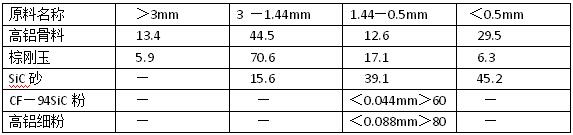 根據(jù)鐵水溝對耐火材料的要求,高鋁碳化硅磚應(yīng)具有良好的熱震穩(wěn)定性、抗鐵水沖砂及耐侵蝕性。約80%以上的磚單重都超過50Kg,故此應(yīng)適當擴大顆粒的極限尺寸。這對磚的熱穩(wěn)定性,耐沖砂和抗侵蝕性都是有益的。配料的顆粒極限尺寸為4mm,各種原料的顆粒組成見下表: