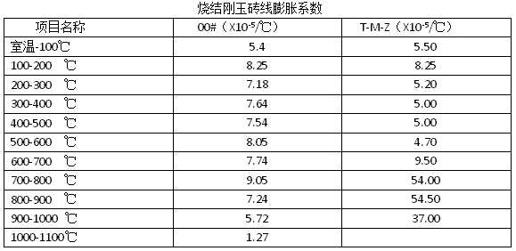 2.00# 燒結(jié)剛玉磚熱膨脹系數(shù)與溫度之間呈直線關(guān)系,在砌筑時僅考慮 0.8~1.0%的線膨脹率。T-M-Z燒結(jié)剛玉磚的線膨脹系數(shù)與溫度之間的關(guān)系不很硅鋁,在700~800℃,800~900℃、900~1000℃之間有突然膨脹現(xiàn)象,但其最大線膨脹率在1.086%,烤窯時應(yīng)注意。