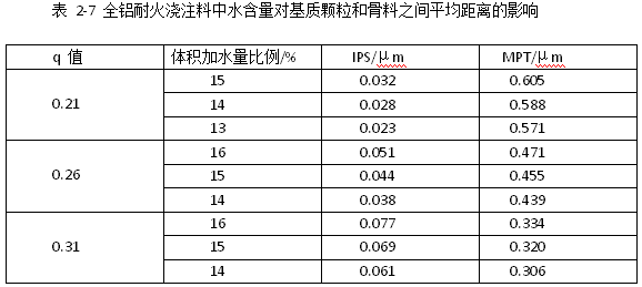 用水量對全鋁耐火澆注料(表2-6)的基質顆粒之間平均距離IPS和骨料之間平均距離MPT的影響見表(2-7)