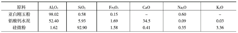 實(shí)驗(yàn)原料研制中選用亞白剛玉顆粒做骨料,采用的是五級(jí)粒度級(jí)配,即1 mm〜3 mm、3 mm〜5 mm、5 mm〜8 mm、8 mm〜12 mm及細(xì)粉,選用鋁酸街水泥作結(jié)合劑,并加入純度達(dá)98%的碳化硅粉以及外加劑硅微粉,硅微粉的添加,主要是代替并減少水泥的用量。為了減少施工加水量并保證有一定的流動(dòng)度,滿足施工要求,外加減水劑三聚磷酸鈉,主要原料的化學(xué)組成見(jiàn)表1。經(jīng)優(yōu)化配方設(shè)計(jì),制備試樣。