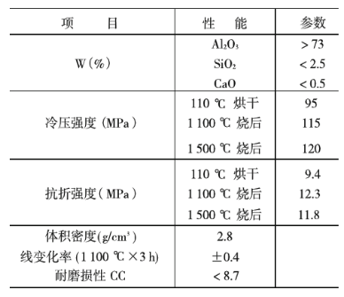 另外,耐磨材料的骨料與基質(zhì)的匹配型和結(jié)合性對(duì)材料的耐磨性具有重要影響:骨料與基質(zhì)失配后會(huì)導(dǎo)致成型后材料本體出現(xiàn)裂紋,而骨料與基質(zhì)的結(jié)合性 差,則會(huì)導(dǎo)致沖刷時(shí)基質(zhì)先被沖蝕,然后骨料被孤立起來(lái),進(jìn)而脫落,所以說(shuō),最佳的耐磨材料是基質(zhì)和骨料以相同的速度被磨損,產(chǎn)生均勻沖蝕。本次實(shí)驗(yàn)?zāi)湍バ阅艿臋z測(cè)是將試樣制作按照耐磨耐火澆注料試件制作方法進(jìn)行,試樣在磨損實(shí)驗(yàn)前經(jīng)600 °C處理,先在200 N負(fù)荷下磨40轉(zhuǎn),以測(cè)定試件表面層的磨損量,接著再磨40轉(zhuǎn)以測(cè)定內(nèi)層的磨損量。經(jīng)測(cè)定,外層磨損量為1.44 kg/m2,內(nèi)層磨損量為1.78 kg/m2。實(shí)驗(yàn)結(jié)果標(biāo)明,耐磨耐火澆注料具有優(yōu)越的耐磨性能,達(dá)到標(biāo)準(zhǔn)。