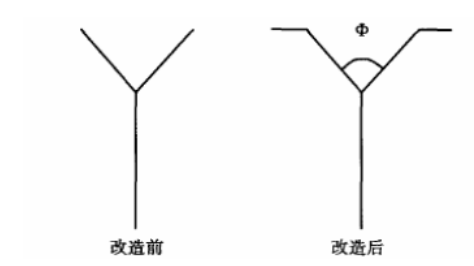 (3)在鍋爐頂棚容易坍塌的的部位,用0 6mm、材質(zhì)為1Cr13的鋼筋焊接做加固處理,以增加抓釘?shù)睦鞆姸。加固筋長度不超過0.5 m,距澆注層外表面25〜35 mm,進行間斷性焊接加固,加固筋采用“[”字形式和頂棚板焊接,或者和“Y”字型抓釘?shù)腣 字口焊接。