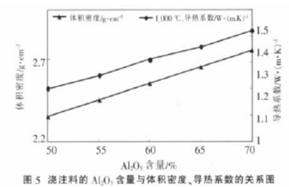 由圖5可知,隨著低水泥澆注料氧化鋁含量的提高,澆注料的體積密度增大,導熱系數(shù)提高。由圖6可知,低水泥澆注料的氧化鋁含量在60%左右時,澆注料的荷重軟化開始溫度較高,可選擇在軋鋼加熱爐的高溫段使用,從性價比來考慮,氧化鋁含量在50%的澆注料可選擇在軋鋼加熱爐的低溫段使用,可達到有效的節(jié)能目的。