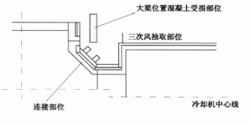 圖1為2號(hào)線2010年1月13日連接部位塌落后照片,框架大梁受到長(zhǎng)期熱輻射,導(dǎo)致混凝土發(fā)生脫落。在2009年3月檢修中工程部曾對(duì)此處進(jìn)行了2天的加固處理,經(jīng)過(guò)此段時(shí),澆注料溫度急劇上升,內(nèi)部水分無(wú)法排出,就會(huì)發(fā)生澆注料“爆頭”現(xiàn)象,導(dǎo)致表面澆注料發(fā)生剝落、凹凸不平,爆裂最深處達(dá)到10mm,嚴(yán)重縮短了澆注料的使用壽命。在2010年3月份檢修過(guò)程當(dāng)中又對(duì)此處進(jìn)行了修復(fù),影響了整個(gè)中修檢修的進(jìn)度。