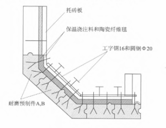 兩條5000t/d生產(chǎn)線,均在較短時(shí)間內(nèi)實(shí)現(xiàn)達(dá)標(biāo)達(dá)產(chǎn)。兩線均采用小窯頭罩,三次風(fēng)是從篦冷機(jī)二段頂上取風(fēng),篦冷機(jī)連接部位因?yàn)殚L(zhǎng)期受到高溫輻射和物料沖刷,很容易造成澆注料脫落和磨薄等情況,此處離大梁較近,施工空間狹小,嚴(yán)重影響澆注料的施工質(zhì)量。