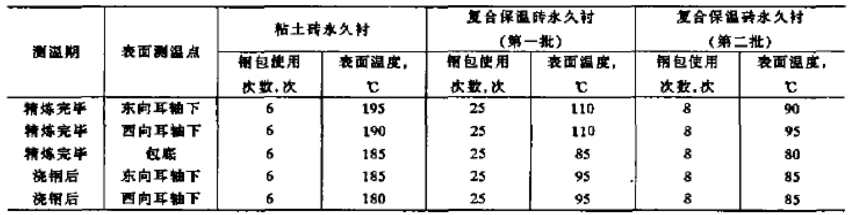 過去,大冶鋼廠為了提高鋼包的隔熱性能,減少鋼水溫降,曾使用過隔熱磚,砌于粘土質(zhì)永久襯和鋼殼之間。這雖然在減少鋼水溫降上起了較好的作用,但由于隔熱磚與粘土質(zhì)永久襯磚結(jié)合的不好,在換砌工作襯時(shí),粘土質(zhì)永久襯常常因剝離而脫落。采用輕重質(zhì)復(fù)合保溫耐火磚后,保溫層與永久襯只砌一個(gè)磚型,與原砌筑普通粘土磚永久襯時(shí)需用T3、T38兩個(gè)磚型相比,砌筑方便簡單,而且復(fù)合保溫磚帶有斜面,砌筑時(shí)相互楔緊,砌筑質(zhì)量也有所提高。為了考核采用復(fù)合保溫耐火磚后的保溫效果,在試用過程中,主要使用表面溫度計(jì)對(duì)鋼包外殼進(jìn)行溫度測(cè)量,并與未用復(fù)合保溫磚的鋼包外殼進(jìn)行溫度比較,其結(jié)果如表3所示。