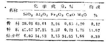 在各種原料確定的基礎(chǔ)上,輕質(zhì)澆注枓的強度是隨結(jié)合劑標(biāo)號和用量的增加而提高的。但標(biāo)號過高或用量過多不僅容重大,水化熱高,線收縮大,而且也不經(jīng)濟。為此選用500#礬土水泥作為結(jié)含劑,其化學(xué)成分見表2。