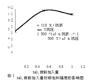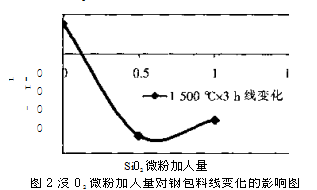 早期一般認為Si02微粉加入到澆注料中,能通過高溫在其表面形成一個致密層,達到增加抗渣的目的。而后有研究則認為Si02含量為0〜2.0%的澆注料,發(fā)現(xiàn)Si02微粉的加入不能抑制渣侵蝕,但增加了結構的耐剝落性。Si02微粉加入量>0.5%導致重燒線變化是負值。還有研究發(fā)現(xiàn)Si02微粉加入量為0.5%的澆注料,其高溫抗折強度急劇下降,而荷重軟化點卻基本上穩(wěn)定;高溫抗折強度從沒加硅微粉的14 MPa減小到加入量為0.5%時的2MPa。在荷重軟化點的試驗中,在0.2MPa荷載下加熱到1660℃的熱膨脹對于沒加硅微粉的澆注料是正值,而對于加入0.5%硅微粉的澆注料則是負值。而且Al203-尖晶石澆注料的高溫抗折強度隨著溫度從1300℃上升到1500℃而不斷增加,而且比高鋁澆注料的還要高得多。但在我們所研究的剛玉-尖晶石體系的鋼包料中,其Si02微粉的加入量在此基礎上則要更加嚴格控制,否則其烘后、燒后性能指標會變化很大。Si02微粉對剛玉-尖晶石鋼包料物理性能的影響見圖1、圖2。
