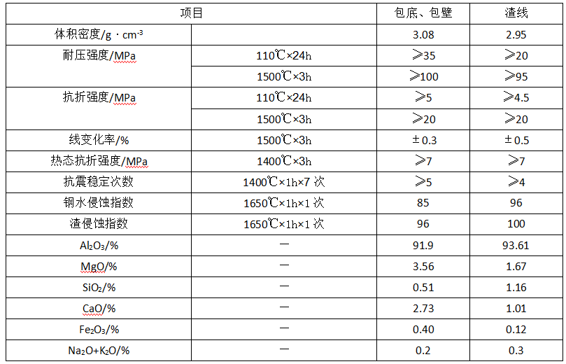 本次研發(fā)的剛玉-尖晶石鋼包料的熱膨脹率小,抗熱剝落性好,高溫強度高,并且通過添加超細尖晶石粉,極大地改善了鋼包料的抗侵蝕和抗?jié)B透性,又通過配入部分尖晶石顆粒使得剛玉-尖晶石鋼包料的抗渣性能進一步的提高。
