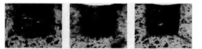 對于新研發(fā)的剛玉-尖晶石鋼包料,我們采用靜態(tài)坩堝法于1600℃x3h進行抗渣侵蝕試驗,分別用武鋼精煉渣、成鋼精煉渣和浦項精煉渣,樣塊切面抗渣侵蝕結果如圖5所示。