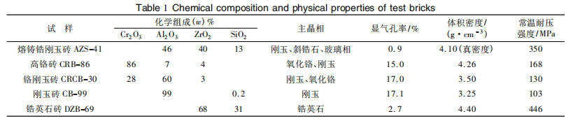 所用試驗磚及其理化性能指標見表1。除熔鑄鋯剛玉磚AZS-41為某公司飛灰熔融爐襯磚外,其他均為中鋼集團洛陽耐火材料研究院有限公司產(chǎn)品。