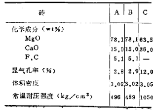 表1為試用磚的質(zhì)量。A是不燒MgO-CaO-C磚,其中配入50%的電熔MgO粒。B配入的電熔MgO粒子比A大(為10~15m)。C是燒成鎂砂白云石磚,這種磚可防剝落,全由富含CaO成分的燒結(jié)粒構(gòu)成。