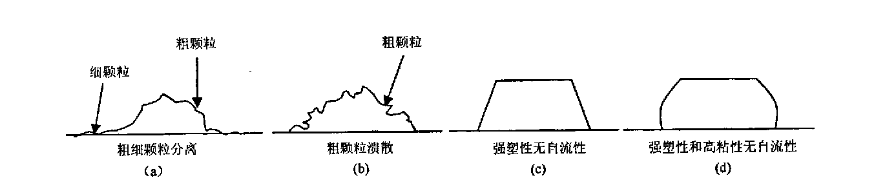 當(dāng)顆粒組成處于1區(qū)時(shí),會(huì)出現(xiàn)粗細(xì)顆粒偏析現(xiàn)象,見圖3(a)。當(dāng)處于2區(qū)時(shí),會(huì)出現(xiàn)粗顆粒潰散現(xiàn)象見圖3(b)。當(dāng)處于3區(qū)和4區(qū)時(shí)會(huì)出現(xiàn)強(qiáng)塑性狀態(tài)見圖3(c)、(d)。只有處于5區(qū)時(shí)才具有自流性能。