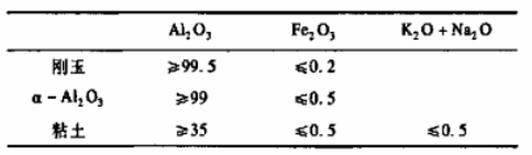 1.2 采用高檔剛玉為主原料,加入部分α-Al2O3及低鐵高塑性的粘土,高溫時生成部分莫來石,以剛玉相為主晶相,莫來石相為結(jié)合相,并加入藍晶石族原料為膨脹劑,保證了產(chǎn)品燒后的體積穩(wěn)定,可塑法成型。添加物燃盡法生產(chǎn)的剛玉莫來石輕質(zhì)磚是在配料中添加一部分可燃物,如木屑、聚苯乙烯球、焦炭等,在燒成時,可燃物燃燒后產(chǎn)生氣孔,因此降低磚的體積密度,用此方法可制成體積密度要求較小的輕質(zhì)磚。采用的添加燃盡物為木屑和聚苯乙烯球,木屑經(jīng)1mm篩選,不雜質(zhì);聚苯乙烯球的直徑2~0.5mm,外觀潔白,粒狀,粒度均勻,原料指標(biāo)見表1。