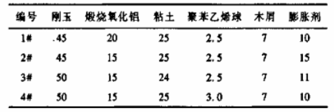按表2中的配方進行配料。配料時,按比例將剛玉、氧化鋁、粘土、膨脹劑加入攪拌機內(nèi)干混3~5min,然后加入可燃物及結(jié)合劑(外加),邊加入邊攪拌,混勻后出碾。