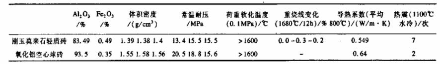 表3 剛玉莫來石輕質(zhì)磚和氧化鋁空心球磚理化指標(biāo)對比