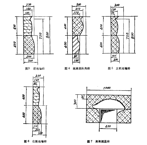 加料口轉(zhuǎn)角與斜角池墻磚采用定型鋯剛玉磚:陬池墻與斜角池墻磚的銜接用高嶺澆注磚加工成異型磚:燒結(jié)剛玉磚用于前池墻及2、3熔化池長的朐池墻。下部400毫米幾乎全部用鋯剛玉,側(cè)池墻角池墻磚的銜接仍用高嶺澆注磚。池墻的構(gòu)筑見圖2。下部用300X400×600毫米的鋯剛玉磚,壁厚300毫米,鑄口朝里,上部用6塊剛玉磚,壁厚230毫米。