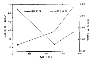 圖1 自流澆注料在不同溫度下的抗壓強度與體積密度變化