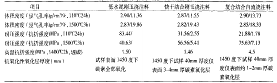 研制的鐵溝澆注料采用剛玉、碳化硅、硅微粉、氧化鋁微粉、碳素材料為基本成分,加入輔助的結(jié)合劑、硬化劑及性能調(diào)整劑;澆注成型,110度干燥后,在1450度燒結(jié)3小時,測定試樣的性能,指標(biāo)如表1。