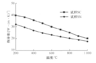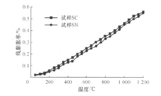 圖1比較了試樣SC和SN的線膨脹率,可以看出試樣SC的線膨脹率略高于試樣SN的。圖2比較了試樣SC和SN兩種材料的熱導率,可看出在600~1000℃范圍試樣SC的熱導率較試樣SN高約10%~25%,這對高爐中部內襯是有利的。