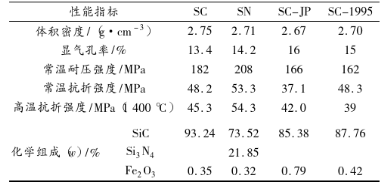 新型自結合碳化硅磚試樣從磚型為530mm×225/206mm×215mm質量為69kg的梯形磚上切取,試樣記為SC;采用本公司生產的磚型為345mm×150mm×75mm的Si3N4結合碳化硅高爐磚作為對比試樣,試樣記為SN。表1比較了試樣SC和SN的常規(guī)理化性能,由表1可知,試樣SC致密度最高,常溫,高溫力學性能良好,略低于試樣SN的,但明顯優(yōu)于試樣SC-JP和SC-1995的;試樣SC中SiC含量明顯優(yōu)于試樣SC-JP和SC-1995的。