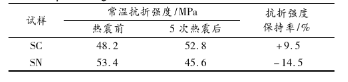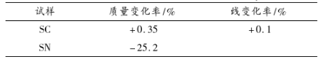 將25mm×25mm×150mm的試樣在常溫下快速置入1350℃電爐內,保溫20min后迅速取出風冷,強制風冷至常溫,循環(huán)5次,測試試樣熱震前后的常溫抗折強度,比較不同試樣的抗折強度保持率,結果見表3。從結果看,風冷熱震后,試樣SC的抗折強度保持率為正,而試樣SN為負,表明試樣SC的抗熱震性能更優(yōu)。