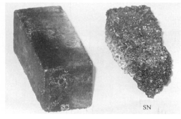 采用與GB/T14983-2008相近的試樣方法。將尺寸為25mm×25mm×70mm的試樣放入不銹鋼盒內,用無水K2CO3掩埋,在N2氣氛、930℃煅燒6h,N2氣氛下冷卻至常溫,在流動的水槽中將試樣充分沖洗,在150℃干燥5h,測試樣侵蝕前后的質量和尺寸的變化,試驗結果見表2。圖3是熔堿侵蝕后試樣的外觀照片。可以看出;試樣SC侵蝕后棱角無缺損,表面平滑,表明K2CO3滲入材料內部不多;而試樣SN侵蝕后棱角缺損嚴重,表面疏松,表明基質侵蝕嚴重。所以,試樣SC表面取樣作XRD分析的結果看出,熔堿試驗后,其物相組成與原樣基本一樣(見圖4),表明次試驗條件下滲入的K2CO3少,K2CO3未與SiC發(fā)生明顯反應。而試樣SN中的Si3N4與K2CO3發(fā)生了明顯反應。而試樣SN中的Si3N4與K2CO3發(fā)生了明顯反應,生成低熔點的偏硅酸鉀和二硅酸鉀,使材料基質遭受嚴重破壞。