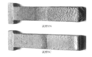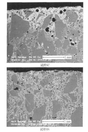 圖5為抗渣試驗后試樣外觀照片。可以看出,肉眼觀察試樣SC和SN未見侵蝕,試樣SC表面附著很薄的一層渣,試樣SN表面的掛渣略多。圖6為試樣靠近渣面的SEM照片?梢钥闯觯嚇覵C表面輕微滲透,內部與表面基質均勻:試樣SN表面約為1mm的熔渣滲透層。