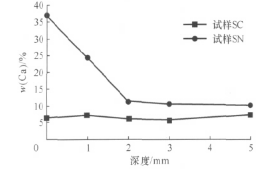 圖7 侵蝕后試樣表面到內部基質中Ca元素含量變化