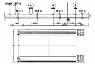 混風(fēng)室中心線到1#熱風(fēng)爐三岔口中心線10.8m,1#與2#、2#與3#熱風(fēng)爐三岔口中心線15m。熱風(fēng)總管外徑3.200m,內(nèi)徑2.096m。爐皮厚度16mm,噴涂層50mm,纖維氈10mm,輕質(zhì)磚采用三層,每層輕質(zhì)磚厚度114mm,重質(zhì)磚采用一次環(huán)砌,重質(zhì)磚厚度152mm。