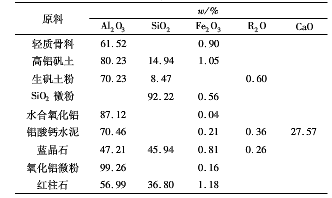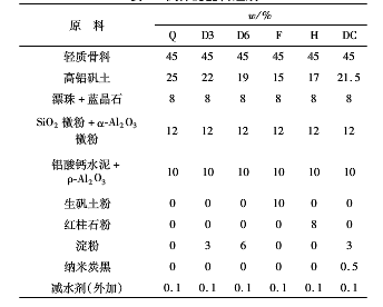 試驗(yàn)用原料有:合成輕質(zhì)骨料,高鋁礬土熟料、漂珠、藍(lán)晶石、二氧化硅微粉、氧化鋁微粉、純鋁酸鈣水泥,以及造孔劑生礬土粉、紅柱石、淀粉、納米炭黑等。原料的化學(xué)組成見(jiàn)表1。