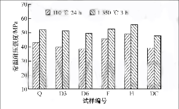 烘干及煅燒后試樣的常溫耐壓強(qiáng)度見(jiàn)圖2。