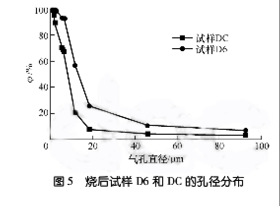 (3)試樣DC基質(zhì)中也有較多的微氣孔,且微孔的分布比試樣D6的更加均勻,大多數(shù)氣孔的直徑<10um。