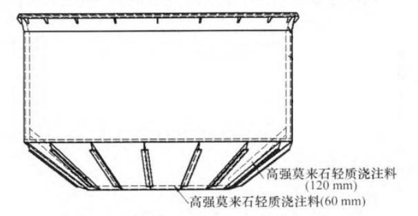 在過去的施工案例中,使用自主生產(chǎn)的高強莫來石輕質(zhì)澆注料作為焦罐的內(nèi)襯材料。其良好的體積密度、耐磨性以及較高的耐壓強度、抗折強度性能能有效滿足紅焦對焦罐內(nèi)襯的要求。在應(yīng)用中,采用錨固釘保證澆注料的穩(wěn)定性,施工后通過自然養(yǎng)護(hù)和烘干后即可投入生產(chǎn)。