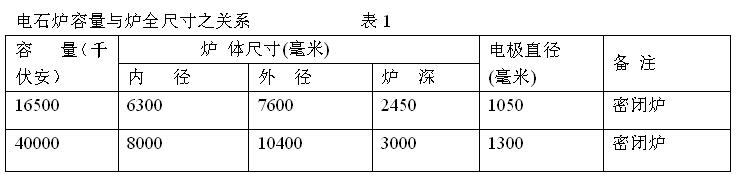 爐體的大小和電極的距離的選擇是非常重要的。當(dāng)尺寸選擇適當(dāng)?shù)臅r(shí)候,電流大部分從電極端頭流經(jīng)反應(yīng)、熔融層而達(dá)爐底。這時(shí)候電石爐的操作十分順利。否則,大量電流從一個(gè)電極經(jīng)過爐料相互擴(kuò)散層和預(yù)熱層流到另一個(gè)電極。這樣一來,電極不能深入爐內(nèi),爐底溫度降低,爐內(nèi)三相不易暢通,電石流出困難,電石爐操作惡化,對(duì)生產(chǎn)十分不利,F(xiàn)將兩種容量的電石爐爐體尺寸與容量的關(guān)系列于表1中。