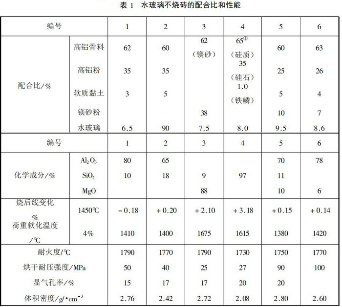 水玻璃不燒磚的使用部位不同,其配合比和性能也不同,F將歸納后的水玻璃不燒磚配合比和性能,列于表1。編號1~3的耐火骨料臨界粒徑分別為6mm,8mm種 10mm,其余的為5mm;水玻璃模數為2.4~3.0,密度為1.38~1.50g/cm³在壓磚機上成型后,進行烘干,溫度約為100℃,干燥時間不少于48h;剞D窯窯襯磚,有時烘至600℃。烘干的不燒磚,其含水率小于1%。