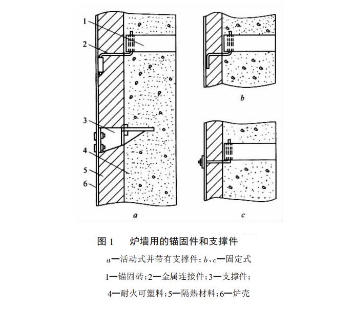 爐墻用材料的選擇,應(yīng)根據(jù)窯爐種類和使用條件而定?傇瓌t是做成輕、重質(zhì)料的復(fù)合爐墻,其厚度分別為40~150mm和230~350mm。輕質(zhì)料可用硅酸鈣絕熱板、耐火纖維氈和體積密度為0.8~1.3g/cm的耐火澆注料或隔熱耐火磚等;重質(zhì)料則分別選用高鋁質(zhì)、黏土質(zhì)、含鉻或含SiC等耐火可塑料,易磨損或個(gè)別高溫部位,也可選用剛玉或莫來石質(zhì)耐火可塑料。下圖為爐墻耐火可塑料施工中用的錨固件和支撐件。