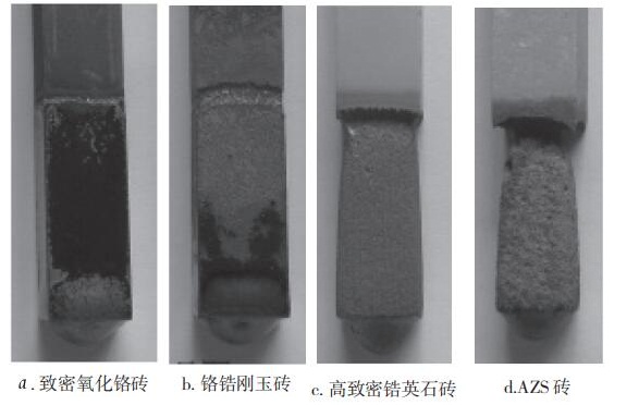 玄武巖纖維池窯法生產(chǎn),首先要考慮窯爐壽命,傳統(tǒng)的玄武巖纖維坩堝爐采用的耐火材料,由于侵蝕快、壽命短,使用在池窯上不經(jīng)濟(jì)。必須選擇更加優(yōu)質(zhì)的耐火材料,需對不同性質(zhì)耐火材料進(jìn)行篩選并進(jìn)行侵蝕實(shí)驗(yàn)。 有資料針對耐火材料致密氧化鉻磚、鉻鋯剛玉磚、高致密鋯英石磚、41#電熔AZS磚進(jìn)行了侵蝕實(shí)驗(yàn)。侵蝕情況見圖 1