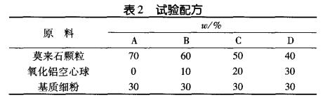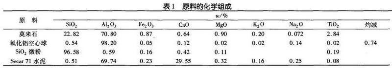 試驗中所用主要原料為粒度分別為 5~3、3~1、≤1和 ≤0.074mm的莫來石及粒度 ≤1mm的氧化鋁空心球 ,以 Secar71純鋁酸鈣水泥為結(jié)合劑。表 1給出 了試驗用原料的化學(xué)組成 ,表 2給出了各原料配比。
