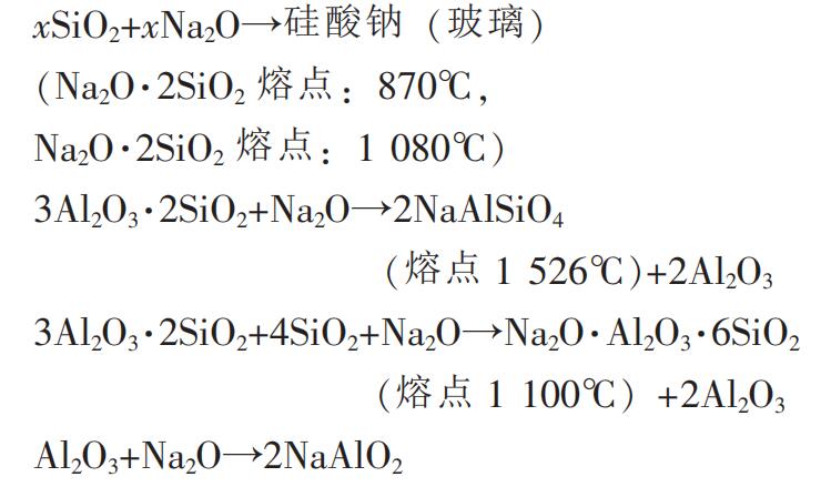 (2)黏土質(zhì)磚和澆注料的礦物組成是莫來(lái)石(3Al2O3·2SiO2)、方晶石(SiO2)、 石英(SiO2) 等,由于 Na2O 的侵入引起下式的反應(yīng):