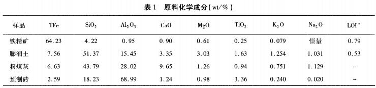 研究從現(xiàn)場取樣見表1鐵精礦取自現(xiàn)場高壓輥磨預處理后,從成分可知混合精礦鐵品位較高(TFe為64.23%),雜質元素含量較低;膨潤土為球團生產常用的粘結劑,含有較高的堿金屬氧化物;粉煤灰為現(xiàn)場取得的煤粉經燃燒后所得,可見其中SiO2和AL23O的含量很高,分別達到了43.788%和 28.023%,另外堿金屬K20和 Na20的含量也較高。預制磚為高鋁質耐火材料(AL2O3為 68.99%),為氧化球團回轉窯內常用的耐火制品,其他雜質含量低,含少量K2O,不利于提高預制磚的耐火度。