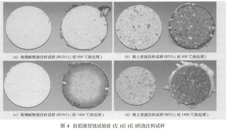 繼續(xù)升高溫度至 900 ℃,保溫120 h。待熔爐自然冷卻到700 ℃,打開坩堝,從熔融金屬中取出試樣。博耐特澆注料與兩種商品澆注料一起進行對比試驗。商品澆注料分別由鋁礬土、硅微粉和 BaSO4 (BX1)或者鋁礬土、活性氧化鋁和 BaSO4 (BX2 )組成。圖1( a) ~( d)顯示了試樣在抗鋁液侵蝕試驗前 (左邊試樣 )和后 (右邊試樣 )的情形。經(jīng)過 800 ℃烘烤后純博耐特質(zhì)澆注料,試驗后顯示不變色 (BON1) ; 試塊內(nèi)部幾乎像試驗前那樣呈白色 ,見圖 4 ( a)。相反 ,試樣 BX1在相同的條件下預(yù)處理并且在加 BaSO4抗浸潤劑的情況下還出現(xiàn)變色?梢杂^察到兩個滲透區(qū):淺黑色的外環(huán)區(qū)域和試樣內(nèi)部直至中心完全變?yōu)榛疑膮^(qū)域 ,見圖 4 ( b)。博耐特澆注料即使在 1400 ℃烘烤 ,抗鋁液侵蝕試驗后也只顯示些許變色 ,見圖 4 ( c) ,然而試樣 BX1顯示黑色 ,見圖 4 ( d)。試驗中觀察到的黃色硫化物氣體 ,說明抗浸潤劑在高溫下分解。
