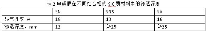 參照表1分別指的Si3N4結(jié)合SiC、Si2N2O結(jié)合SiC、Sialon結(jié)合SiC質(zhì)坩堝,坩堝尺寸為φ50X50,中孔為φ25X25。坩堝內(nèi)裝電解質(zhì)15g,于975℃下保溫6小時,實驗后沿直徑方向切開坩堝。經(jīng)EDAX分析,電解質(zhì)在坩堝中的滲透深度如表2所示。