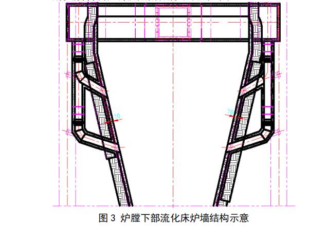 布風(fēng)裝置及水冷風(fēng)室內(nèi)部點(diǎn)火時溫度 900℃左右,正常運(yùn)行在150℃左右,不存在磨損現(xiàn)象,但溫度變化大,熱沖擊劇烈。對耐火材料要求有較高的抗熱震穩(wěn)定性,不應(yīng)輕易 發(fā)生脫落現(xiàn)象。耐火層材料應(yīng)采用磷酸鹽耐火混凝土如圖2