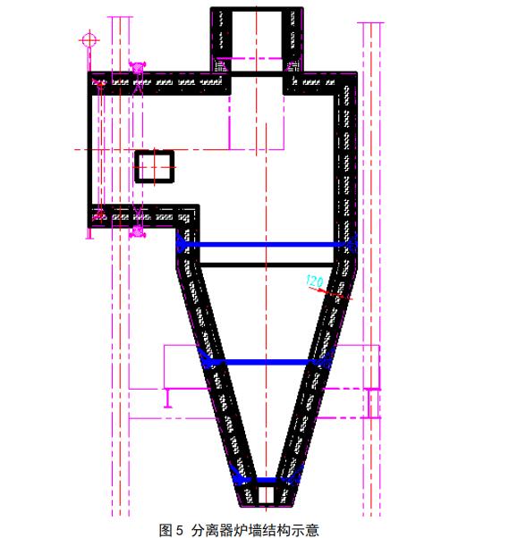 此處工作溫度 800℃~1000℃左右,高溫?zé)煔鈹y帶著床 料粒子從爐膛進(jìn)入旋風(fēng)分離器時,在流經(jīng)出煙口處,氣、固兩相流動速度急劇增大,灰濃度較高,出煙口及其相鄰的后水冷壁周圍區(qū)域受到粒子的沖刷磨損嚴(yán)重,對耐火材料要求有良好的抗磨性能且不易脫落。耐火層材料應(yīng)采用高強(qiáng)度耐磨耐火澆注料如圖 4。